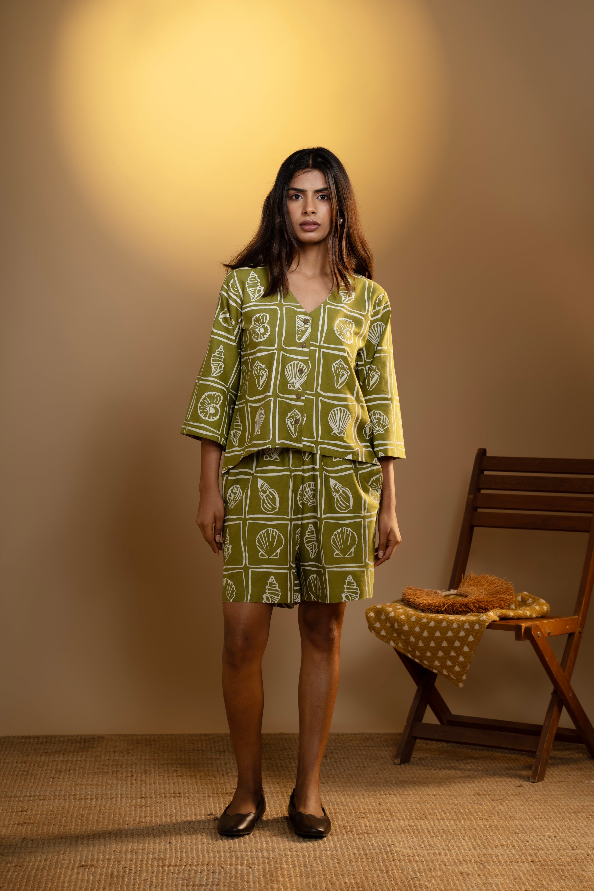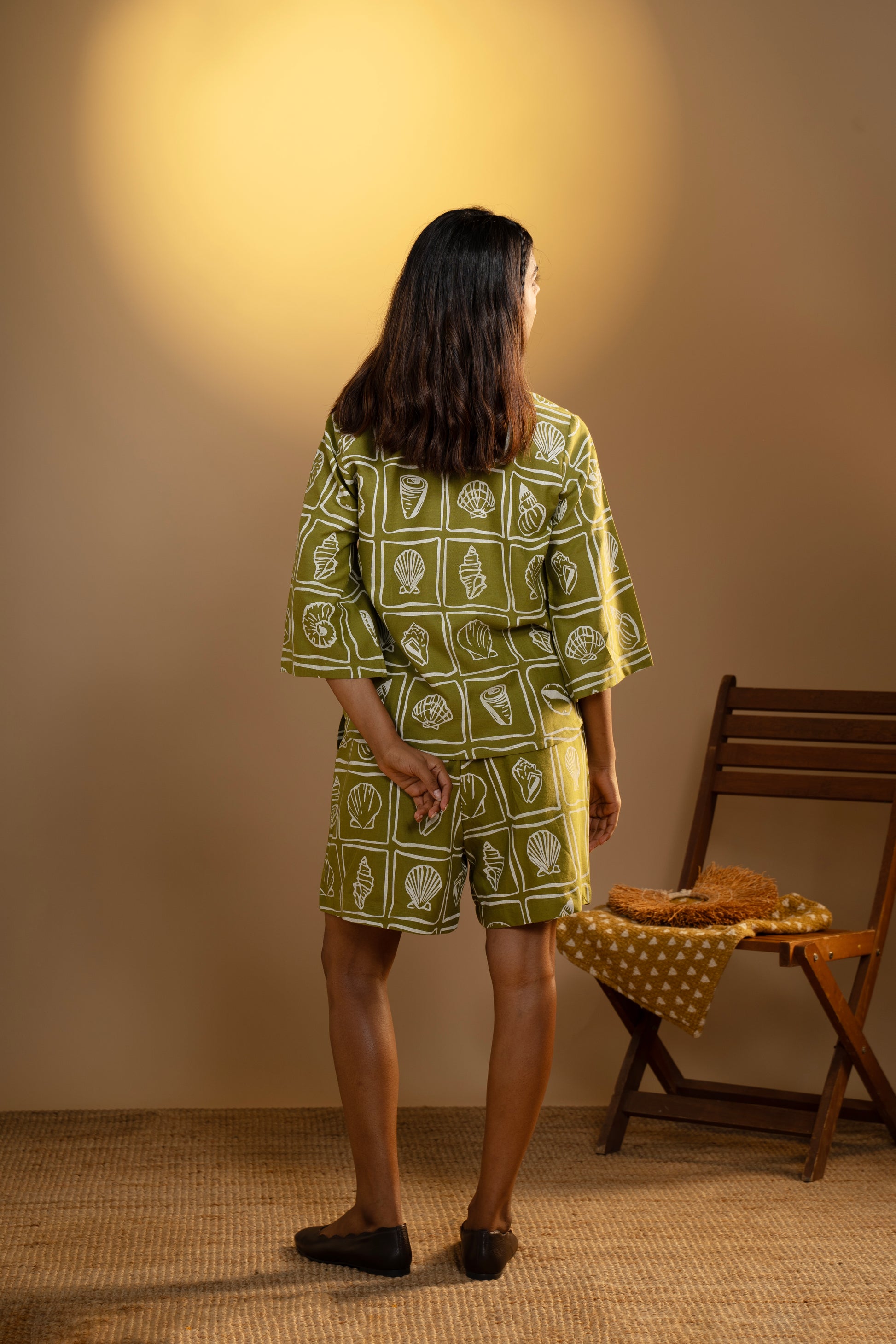 The Shell Stories Co-Ord Set is inspired by the gentle beauty of seashells scattered along the shoreline—each one telling a quiet story of the sea. With hand-drawn shell motifs printed in an earthy block-style design, this set is perfect for those who love to wear nature with ease and style.