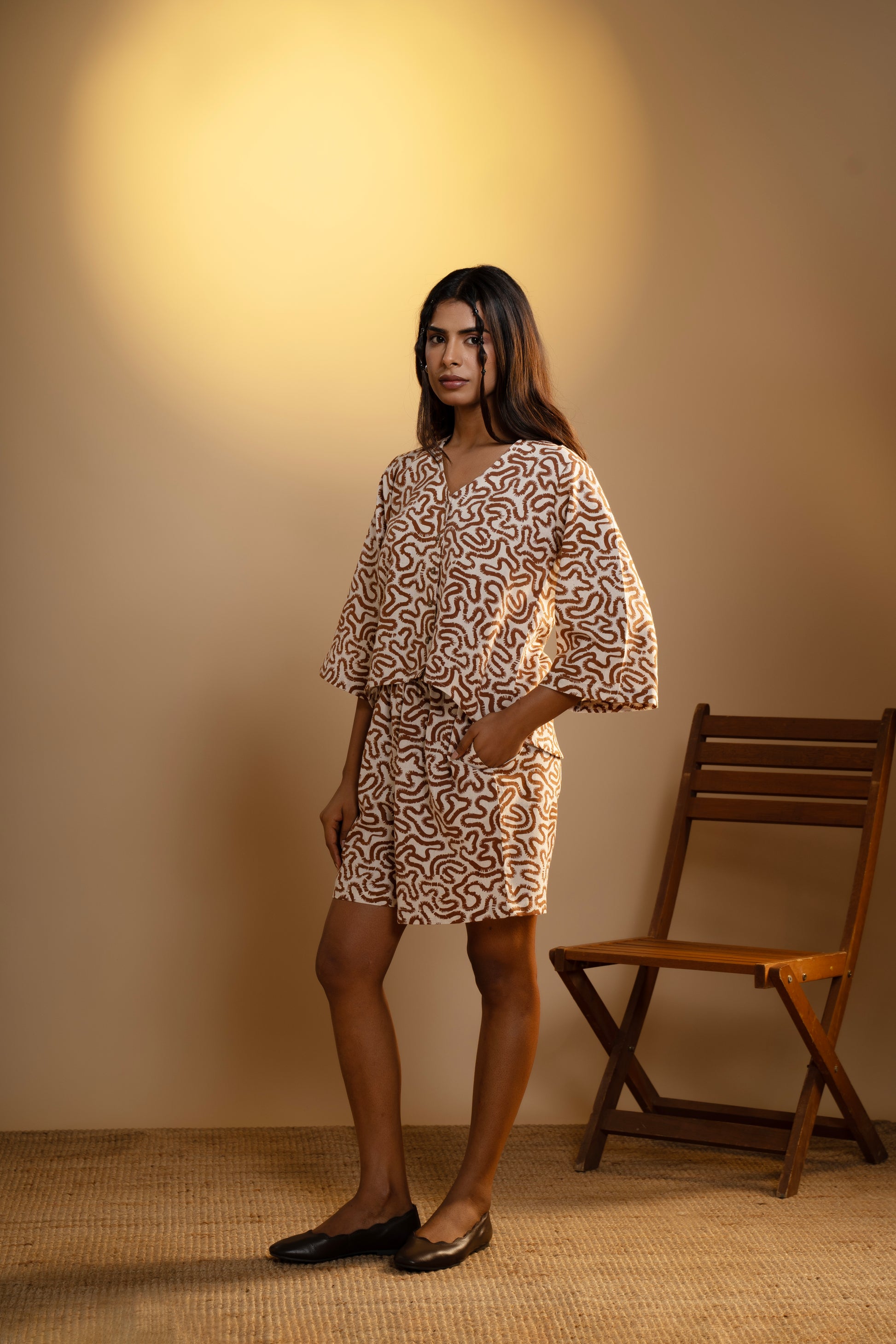 The Coral Maze Co-Ord Set is inspired by the intricate and mesmerizing patterns of brain coral formations found deep in the ocean. Just like nature’s own geometry, this print is all about embracing complexity in a calm, wearable way.